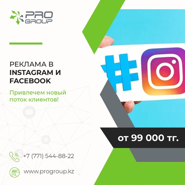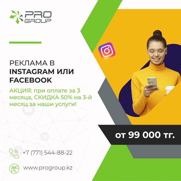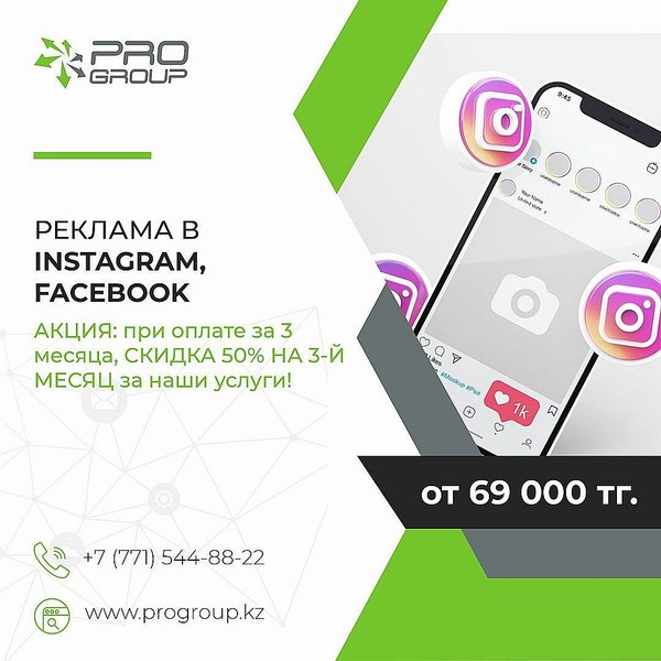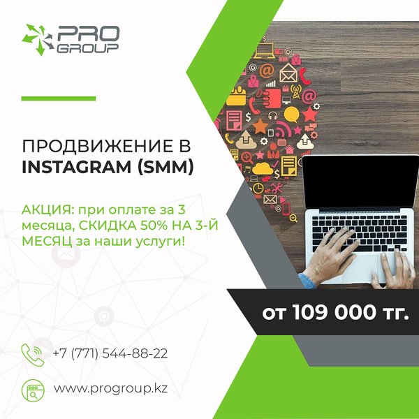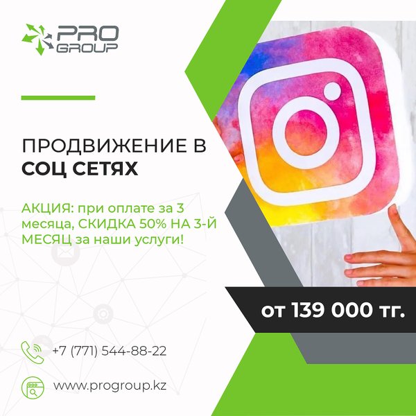 ии (заявки, запросы) Настройка, запуск, ведение таргетирование рекламы + бюджет от 100 000 тнг. для 1 соц. сети Предоставление отчета о результатах БОНУС: Создание иконок для Актуального/размещение информации (до 5/1 шт.) АКЦИЯ: при оплате за 3 месяца, СКИДКА 50% НА 3-Й МЕСЯЦ за наши услуги! Закажите продвижение в Instagram от Progroup! ️ ️ Алматы, ул. Айманова, 220 progroup.kz