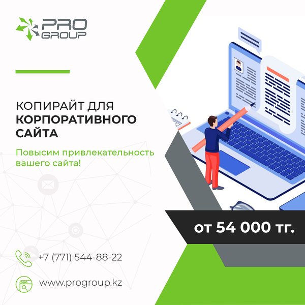 Копирайт для корпоративного сайта Пакет от 54 000 тнг. До 10 страниц: 16 000 — 20 000 символов Анализ существующего контента сайта Написание уникального текста Оптимизация подготовленных текстов для поисковых систем Публикация готовых текстов на сайте Срок выполнения: 1—2 недели Цепляющий и информативный текст повысит привлекательность вашего сайта, сделает его более удобным и читабельным. Закажите копирайт для корпоративного сайта в Progroup! ️ ️ Алматы, ул. Айманова, 220 progroup.kz