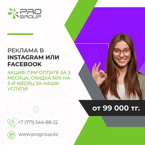 ии ️Запуск таргетированной рекламы, ежедневная аналитика и оптимизация ️Предоставление отчета о результатах + рекламный бюджет от 100 000 тнг. При рекламном бюджете от 150 000 тнг., стоимость услуг рассчитывается индивидуально АКЦИЯ: при оплате за 3 месяца, СКИДКА 50% НА 3-Й МЕСЯЦ за наши услуги! ⠀ Закажите рекламу в INSTAGRAM и FACEBOOK, чтобы поднять охваты и привлечь новый поток клиентов для вашей компании! Агентство ProGroup ️ ️ Алматы, ул. Айманова, 220 progroup.kz