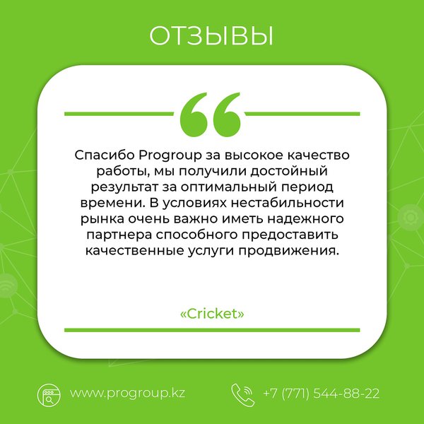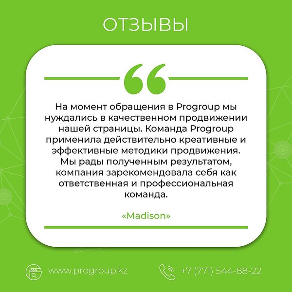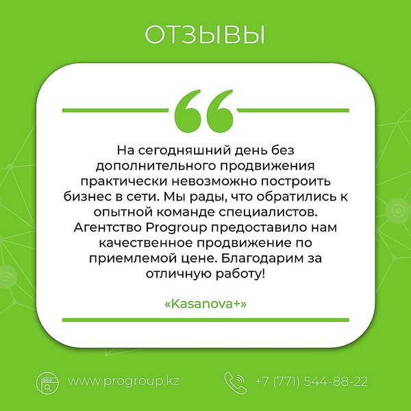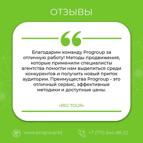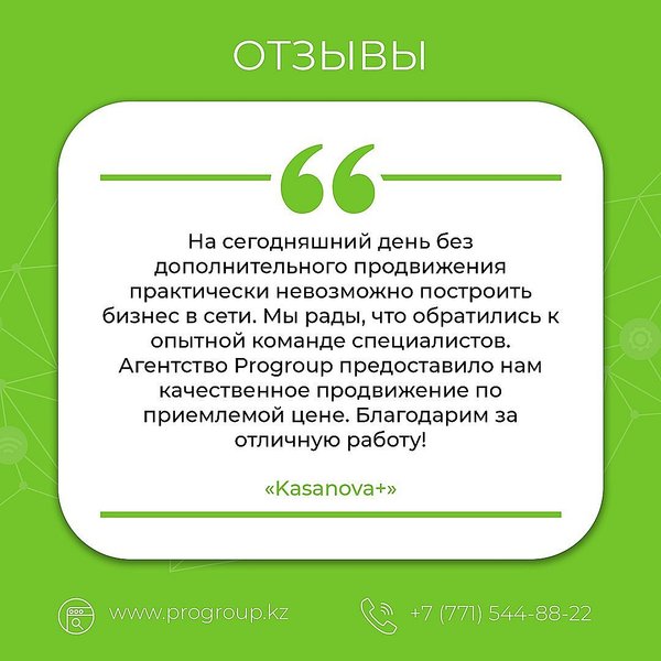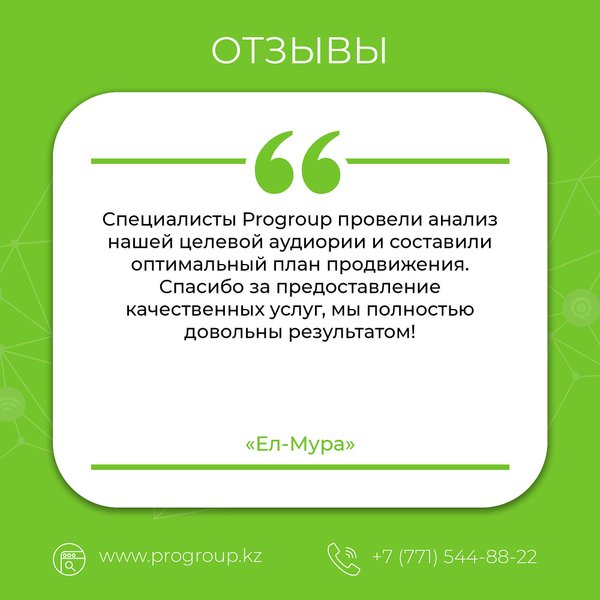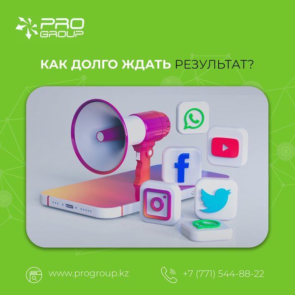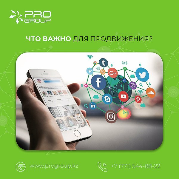 аться. Займитесь конверсией. Очень важно превратить активного пользователя в клиента. Для этого необходимо уметь мотивировать пользователя перейти на сайт или совершить покупку, можно периодически использовать различные акции, бонусы и розыгрыши. Отслеживайте результаты продвижения. Следите за количеством подписчиков и их активностью, за переходами на сайт и ростом продаж. Если эти показатели постоянно растут, то вы на верном пути. Также рекомендуется сравнивать показатели между собой как минимум раз в полгода. Это поможет добиться лучшего эффекта. Агентство Progroup⠀ ️ ️ Алматы, ул. Айманова, 220 progroup.kz