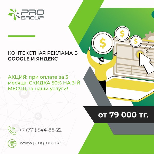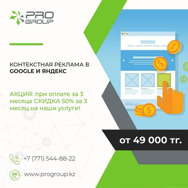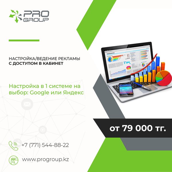 дреса, номера телефонов и др. Настройка UTM меток Кол-во переходов на сайт: от 200 до 500 Установка на сайт Яндекс Метрики или Google Analytics Полный Анализ Целевой Аудитории Ведение кампании Отчетность 1 раз в месяц (Отчет предоставляется в pdf файле без доступов в личный кабинет) + рекламный бюджет от 50 000 тнг. АКЦИЯ: при оплате за 3 месяца, СКИДКА 50% НА 3-Й МЕСЯЦ за наши услуги! Закажите контекстную рекламу в Google и Яндекс! ️ ️ Алматы, ул. Айманова, 220 progroup.kz
