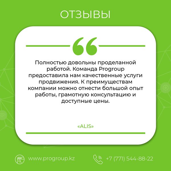 Отзыв: аудиторская компания ALIS Благодарим за отличный отзыв! ⠀ ️ ️ Алматы, ул. Айманова, 220 progroup.kz .