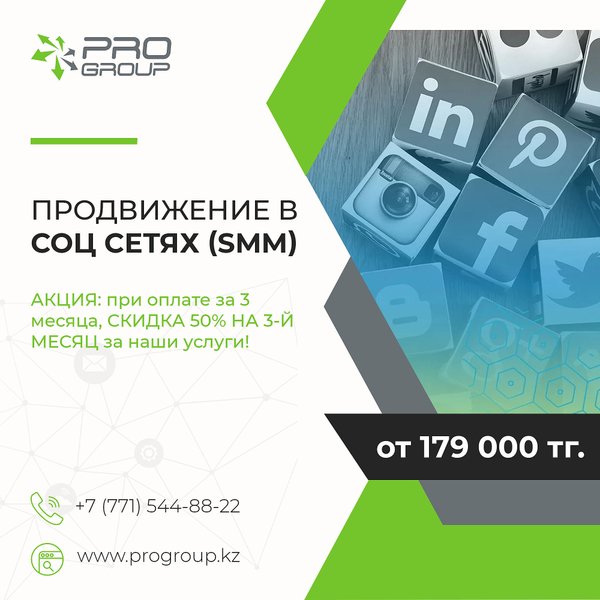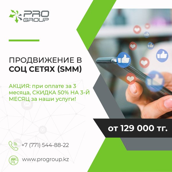 рса в месяц Отслеживание, ответы на вопросы пользователей Привлечение целевой аудитории (заявки, запросы) Настройка, запуск, ведение таргетирование рекламы + бюджет от 100 000 тнг. для 1 соц. сети Предоставление отчета о результатах БОНУС: Создание иконок для Актуального/размещение информации (до 5/1 шт.) АКЦИЯ: при оплате за 3 месяца, СКИДКА 50% НА 3-Й МЕСЯЦ за наши услуги! Повысьте узнаваемость своего бренда при помощи регулярного и качетсвенного постинга. Закажите пакет SMM BASIC «ПОД КЛЮЧ»! ️ ️ Алматы, ул. Айманова, 220 progroup.kz