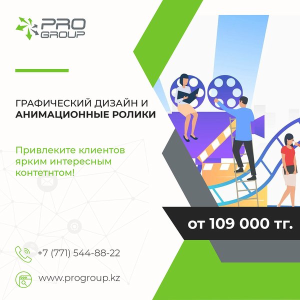 Графический дизайн и анимационные ролики Пакет «БИЗНЕС» от 109 000 тнг. Графический видеоролик со сценарием с нуля, креативные идеи и подход. Написание сценария Озвучка диктором Музыка Full HD (1080p) Срок выполнения: 10 дней Количество секунд: 30 сек. Яркий и цепляющий видеоролик поможет вам вызвать интерес к вашему продукту и привлечь новых клиентов. Наша команда имеет большой опыт в графическом дизайне и создании анимационных видеороликов, обращайтесь в Progroup! ️ ️ Алматы, ул. Айманова, 220 progroup.kz