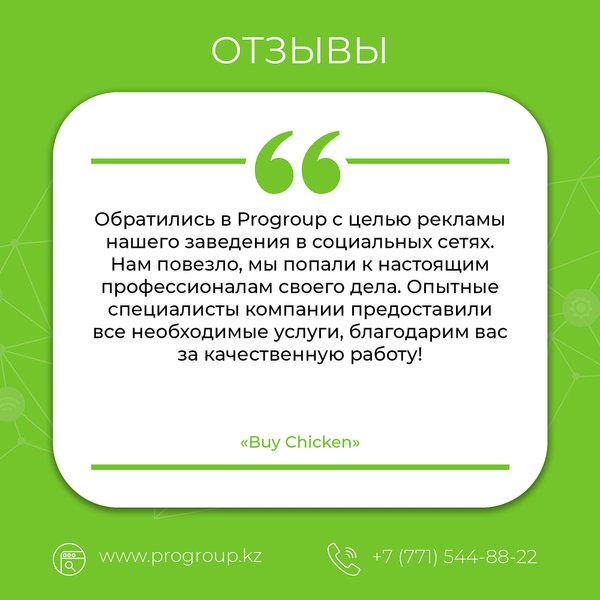Отзыв: Buy Chicken, кафе Благодарим за высокую оценку нашей работы! ⠀ ️ ️ Алматы, ул. Айманова, 220 progroup.kz .