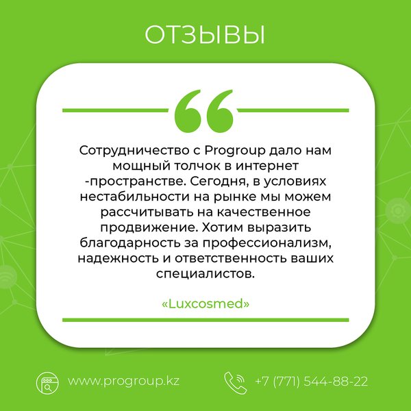 Отзывы наших клиентов: «Luxcosmed» ⠀ Друзья, делимся с вами очередным приятным отзывом ️ ⠀ Агентство Progroup ️ ️ Алматы, ул. Айманова, 220 progroup.kz