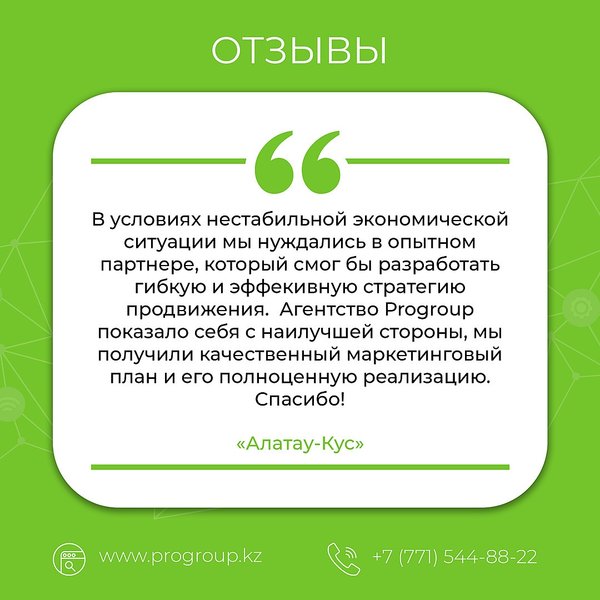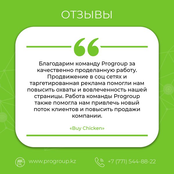 Отзыв: Птицефабрика «Алатау-құс» Благодарим за высокую оценку нашей работы! ⠀ ️ ️ Алматы, ул. Айманова, 220 progroup.kz