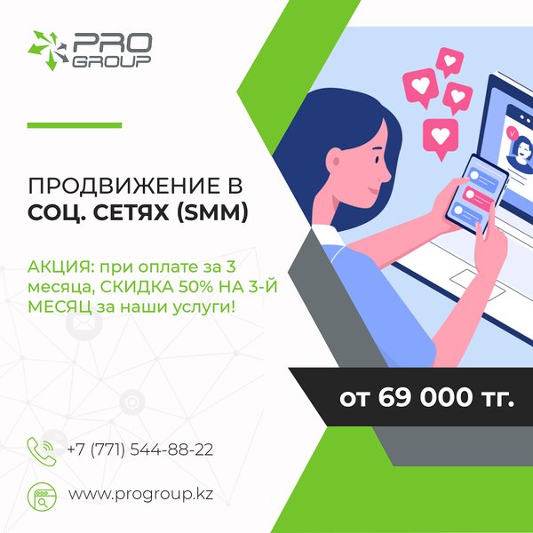 е, ответы на вопросы пользователей Привлечение целевой аудитории (заявки, запросы) Настройка, запуск, ведение таргетирование рекламы + бюджет от 40 000 тнг. для 1 соц.сети Предоставление отчета о результатах БОНУС: Создание иконок для Актуального/размещение информации (до 5/1 шт.)⠀ АКЦИЯ: при оплате за 3 месяца, СКИДКА 50% НА 3-Й МЕСЯЦ за наши услуги! ⠀ SMM-продвижение от Progroup повысит узнаваемость вашего бренда и привлечет новый поток клиентов! ️ ️ Алматы, ул. Айманова, 220 progroup.kz