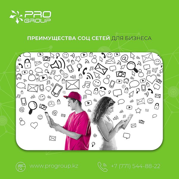 атную связь и открывая новые возможности. Самое чёткое сегментирование. Изначально социальные сети проектировались так, чтобы пользователь мог оставлять информацию о себе в виде анкетированных данных. За счёт этого эффективность показов такой рекламы крайне высока. Крайне низкая стоимость рекламы. Если сравнить с рекламными плакатами и стоимостью аренды рекламных носителей, то стоимость SMM очень мала, а ROI (возврата инвестиций) исчисляется сотнями процентов. Агентство Progroup ️ ️ Алматы, ул. Айманова, 220 progroup.kz