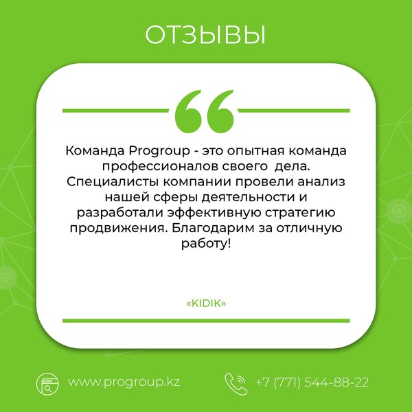 льное продвижение сайта позволяет значительно и гарантированно увеличить целевую аудиторию ресурса. Наша компания – это грамотная и подготовленная команда специалистов, которые разбираются во всех тонкостях и особенностях повышения популярности и рентабельности сайта для наращивания прибыли и увеличения количества просмотров страниц. Агентство «Progroup» ️ ️ Алматы, ул. Айманова, 220 progroup.kz