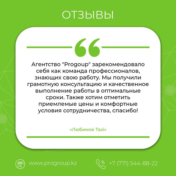 Отзыв: «Любимое Taxi» ⠀ Благодарим за сотрудничество и теплый отзыв! ⠀ ️ ️ Алматы, ул. Айманова, 220 progroup.kz