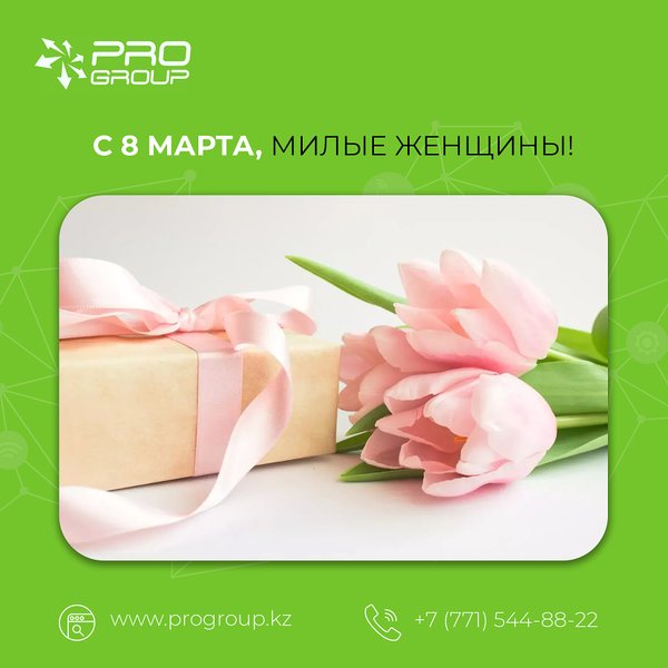 Дорогие женщины! Поздравляем вас с Международным Женским днем – 8 марта! Этот день – символ вашей красоты, таланта, умения любить и дарить свою заботу и тепло окружающим. Желаем вам много радости, любви, добра и удачи, оставаться всегда жизнерадостными, красивыми и успешными. Пусть здоровье и счастье всегда будут с вами рядом, а любовь и поддержка близких окружают вас каждый день! Агентство Progroup ️ ️ Алматы, ул. Айманова, 220 progroup.kz