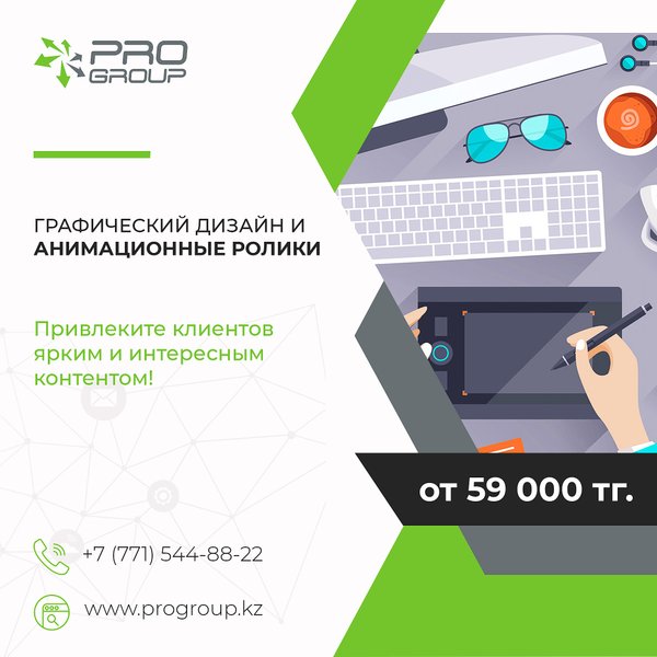 Создание графического дизайна и анимационных роликов Пакет «Бизнес» от 109 000 тнг. Графический видеоролик со сценарием с нуля, креативные идеи и подход. Написание сценария Озвучка диктором Музыка Full HD (1080p) Срок выполнения: 10 дней Количество секунд: 30 сек. Яркий и интересный контент — это что поможет вашему бизнесу рассказать о себе, прорекламировать услуги\товары и привлечь новый поток клиентов. Обращайтесь в Progroup! ️ ️ Алматы, ул. Айманова, 220 progroup.kz