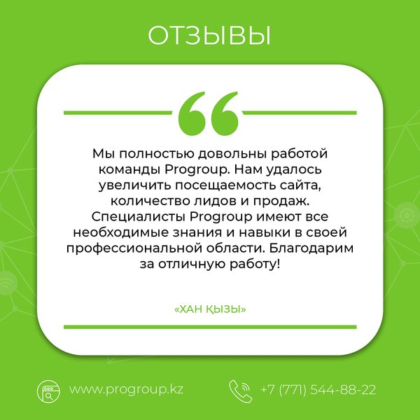Отзыв: магазин невесты «ХАН ҚЫЗЫ» Благодарим «ХАН ҚЫЗЫ» за плодотворное сотрудничество! Мы предлагаем эффективные решения, повышающие узнаваемость бренда в сети. ⠀ ️ ️ Алматы, ул. Айманова, 220 progroup.kz