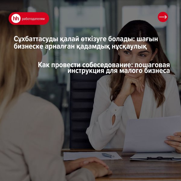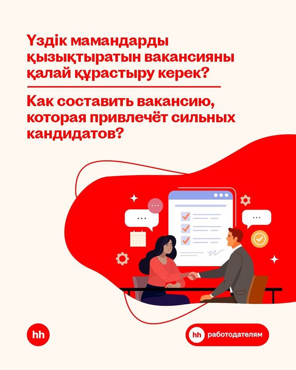 Первый контакт с кандидатом происходит не при личном общении, а в тот момент, когда соискатель только увидел вашу вакансию. Как произвести хорошее впечатление? Напишите привлекательный и понятный текст публикации! Какой должна быть структура вакансии? ___________________________ Үміткермен алғашқы байланыс жеке қарым-қатынас кезінде емес, жұмыс іздеуші сіздің бос орныңызды көрген сәтте іске асады. Қалай жақсы әсер қалдыруға болады? Басылымның тартымды және түсінікті мәтінін жазыңыз! Бос орын құрылымы қандай болуы керек?