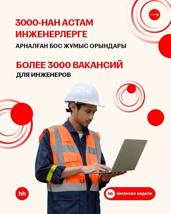 По данным на июнь 2025 года на сайте hh.kz размещено более 3000 вакансий для инженеров. А какая подходит именно вам? Переходите на сайт hh.kz и найдите работу своей мечты! Ссылка на вакансии в сторис • 2025 жылдың маусым айындағы деректер бойынша hh.kz сайтында инженерлерге арналған 3000-нан астам бос жұмыс орны бар. Ал сізге қайсысы сәйкес келеді? hh.kz сайтына өтіп, арманыңыздағы жұмысты табыңыз! Вакансияларға сілтеме stories-те