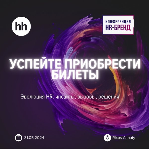 рые ускорят развитие вашего бренда. • Энергичное и динамичное обучение, которое даст вам навыки для успешного выстраивания HR-стратегий. • Практические кейсы от ведущих компаний региона, которые стали пионерами в создании сильного HR-бренда. Получить подробную информацию о программе и спикерах конференции вы можете на нашем сайте • Место проведения: отель Rixos Almaty, пр-т. Сейфуллина 506/99, г. Алматы. Кроме того, у вас есть возможность присоединиться к конференции онлайн. • Дата и время: 31 мая 2024 года, начало в 09:00 (Конференция продлится с 09:00 до 19:00, а затем состоится торжественная Премия с 19:00 до 21:00). • Дресс-код: мы предлагаем вам проявить свой стиль в рамках Smart casual, выбирая total black, black&white или black&gold. Для приобретения билета обратитесь к вашему персональному менеджеру.