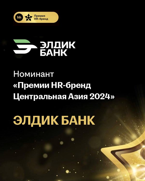ника, а также на развитии компетенций, которые повышают эффективность и адаптивность к изменяющимся требованиям банка и рынка. HR-стратегия ELDIK-META является инструментом для ускорения цифровой трансформации банка, реализации модели клиентоцентричности и внедрения ESG-принципов в бизнес-процессы. Eldik Bank приглашает присоединиться к своей команде и стать частью экосистемы, которая строит будущее финансового сектора. • Премия HR-бренд Орталық Азия 2024 номинанты — Eldik Bank ️ Eldik Bank — 1996 жылы құрылған Қырғызстанның жетекші банктерінің бірі. Жұмыс істеген жылдары банк өзіне сенімді қаржылық құрылым ретінде танылып, клиенттерінің сенімін иеленді, бұл сенім тұрақты түрде өсіп келе жатқан клиенттер базасымен дәлелденеді. Банк нарықтың қазіргі және болашақ қажеттіліктерін ескере отырып, дамуын жалғастыруда. Eldik Bank E-META жобасын таныстырды — қазіргі корпоративтік мәдениетті қалыптастыруға бағытталған бірегей бағдарлама. Негізгі назар қызметкердің жаңа бейнесін қалыптастыруға, сондай-ақ банктің және нарықтың өзгеретін талаптарына бейімделу мен тиімділікті арттыратын дағдыларды дамытуға аударылған. ELDIK-META HR-стратегиясы банктің сандық трансформациясын жеделдету, клиентке бағдарлану моделін іске асыру және ESG-принциптерін бизнес-процестерге енгізу үшін құрал болып табылады. Eldik Bank командаға қосылып, қаржы секторының болашағын құратын экожүйенің бір бөлігі болуға шақырады.
