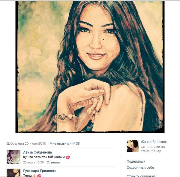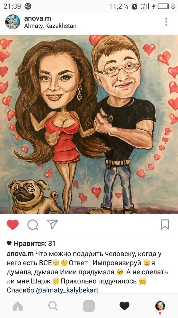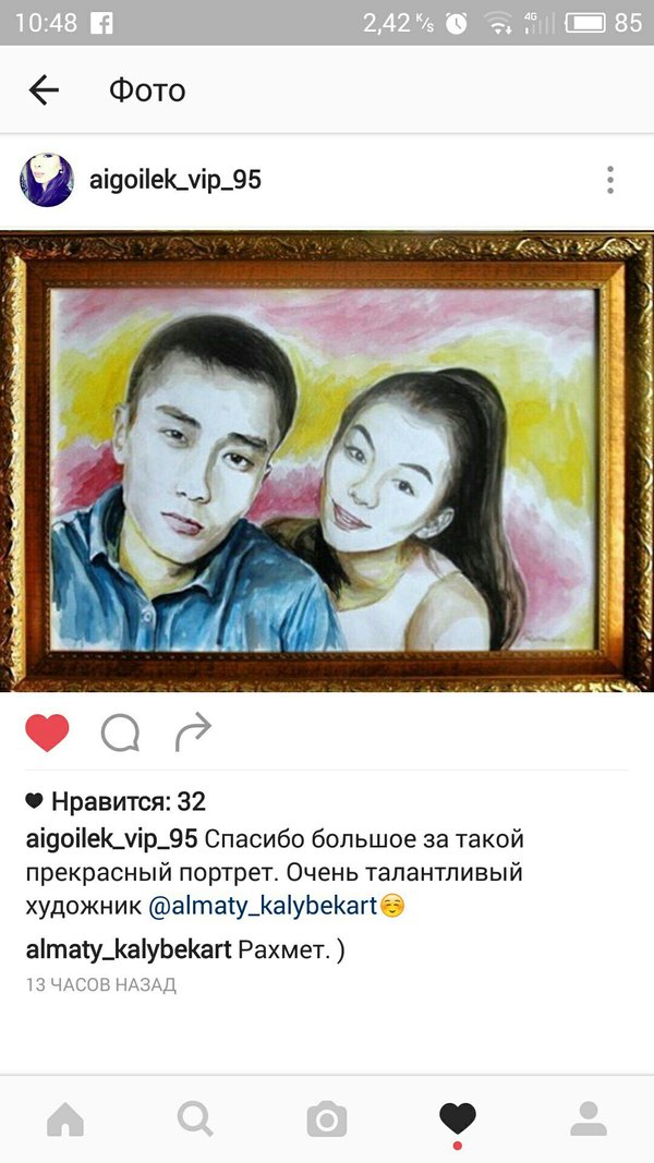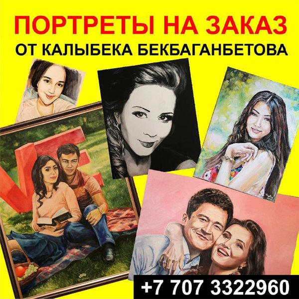 рядом. 4) Заказав портрет Вы покажете человеку, что Вы близки к Искусству, Культуре, что будет плюсом в глазах получателя подарка. 5) Парфюм может окончиться, а картина будет долго висеть у человека дома на стене 6) Каждый человек считает себя красивым, и ему будет приятно видеть себя на картине. 7) На Свадьбах, Юбилеях лучше подарить портрет нежели невзрачный конверт или очередной пылесос. 8) Картина написанная действующим Художником растет ценой с каждым годом. Даря Картину Вы дарите богатство человеку. 9) Если человек Вам дарит Портрет, значит этот человек Вас Признает. Подарите любимому человеку Признание! На таком подарке нельзя экономить, Вы создаете свой имидж и благоприятное отношение к себе со стороны получателя подарка. Пишите на Ватсап: P.S. Количество заказов ограничено, так как у художника одна пара рук, поэтому можете оказаться в очереди, и поэтому пишите незамедлительно. Подписывайтесь в Паблике Художника: Instagram: Almaty_KalybekArt