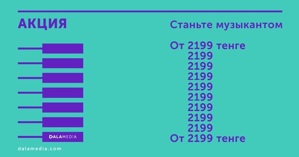 Цифра дня – 44 Именно столько учеников уже посещают музыкальные занятия в школе Dalamedia. Пополняйте ряды будущих музыкантов и присоединяйтесь к классам. Справки по телефону: Күннің саны — 44 Дәл осынша шәкірттер Dalamedia мектебіндегі музыка сабақтарына қатысуда. Болашақ музыканттардың қатарын толтырыңыздар және сыныптарға бөлініңіздер. Анықтама телефондары: