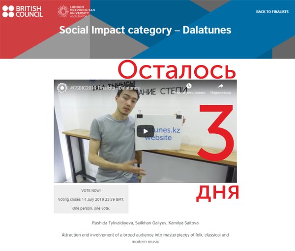 Друзья. Проекту Dalatunes как никогда нужна ваша поддержка и помощь! Нам осталось совсем немного, чтобы закончить вторую версию сайта и доработать прекрасное приложение. Мы хотим продолжать выпускать интересные редакционные материалы и видео-уроки. Не останавливать поиски в архивах. Для всего этого нам необходимо получить грант. КБТУ и British Council (Британским Советом) уже поддержали нас. Поддержите и вы — проголосуйте за наш проект (нужно нажать под видео VOTE NOW!). Ссылка