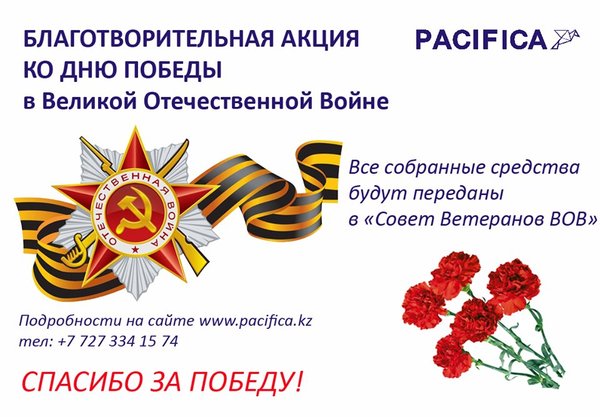 изделия Постельное белье Полотенца Шампунь Мыло Акция не подразумевает сбор денежных средств. Все собранные подарки будут переданы ОФ Совет ветеранов ВОВ, тружеников тыла и детей войны г. Алматы. Период проведения акции: с 17 апреля по 07 мая 2015 г. сбор средств; 08 мая — передача средств. Прием благотворительной помощи происходит в офисе Компании Пацифика по адресу: Казахстан, 050060, Алматы, ул. Тимирязева 42, Бизнес-центр «Экспо-сити», павильон 15/7 Заезд со стороны ул. Жарокова, уг. ул. Утепова. Тел.:, e-mail: info@pacifica.kz