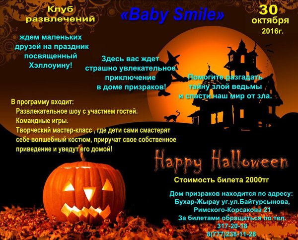 Здесь вас ждет страшно увлекательное приключение в доме призраков! Помогите разгадать тайну злой ведьмы и спасти наш мир от зла. В программу входит: Развлекательное шоу с участием гостей. Командные игры. Творческий мастер-класс, где дети сами смастерят себе волшебный костюм, приручат свое собственное приведение и уведут его домой! Мы ждем вас 30 октября 2016 года. Стоимость билета 2000тг Дом призраков находится по адресу: Бухар-Жырау уг… — Читать дальше