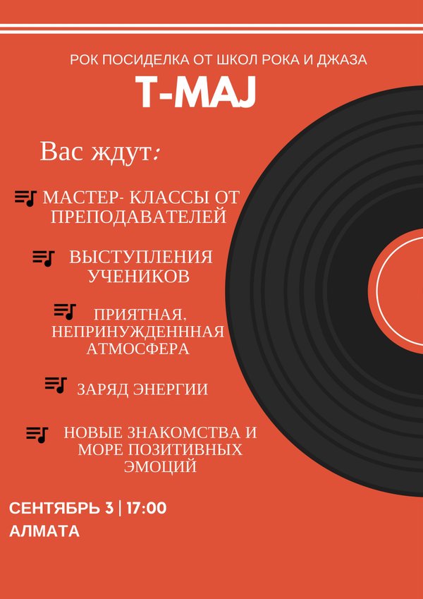 Друзья! В это воскресенье (СЕГОДНЯ), в 17:00, в школе рока и джаза T-MAJ города Алматы, пройдет очередная Рок-посиделка, для учеников и гостей школы Будет много интересного : — мастер -классы — номера от учеников — конкурсы и многое другое. Будем рады видеть каждого