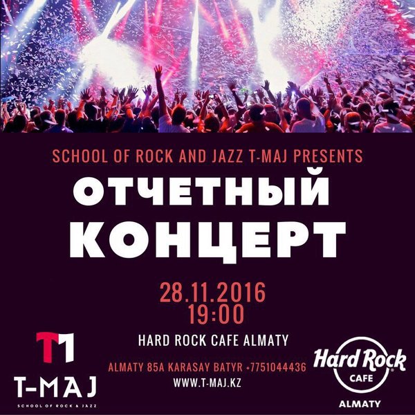 Пятый отчётный концерт школ рока и джаза «T-MAJ» (23.11.2016): Дорогие друзья! Приглашаем Вас на отчетный концерт наших учеников, который состоится 28 ноября в 19:00 в Хард Рок Кафе. Приходите, приводите своих друзей и ПРИГОТОВЬТЕСЬ ЗАЖИГАТЬ ВМЕСТЕ С НАМИ