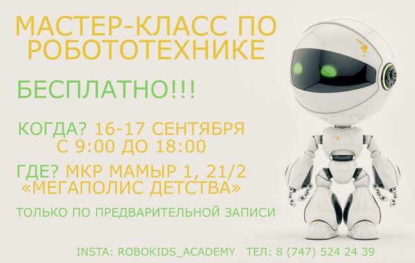 Внимание Мастер-класс по робототехнике. Приходи и ты узнаешь о нашем курсе все и соберешь своего первого робота. Записывайтесь на мастер-класс по номеру. Только по предварительной записи!
