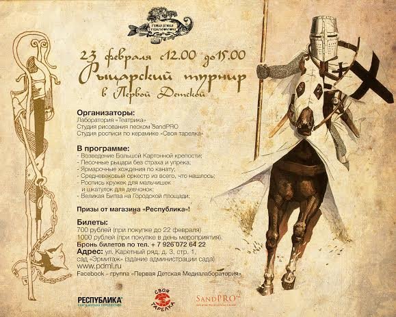 Друзья! 23 февраля Первая Детская Медиалаборатория () проводит на своей территории «Первый Детский Рыцарский турнир». Мастера Студии рисования песком SandPRO, Лаборатории «Театрика» и Студии росписи по керамике «Своя тарелка» готовят для мальчиков и девочек программу, в которой ожидаются следующее немыслимое: — Возведение Большой Картонной крепости; — Песочные рыцари без страха и упрека (песочный мастер-класс от Студии рисования песком СэндПРО) — Ярмарочные хождения по канату; — Средневековый оркестр из всего, что нашлось; — Роспись кружек для… — Читать дальше