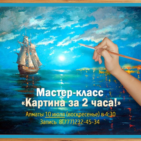 Мастер класс Картина за 2 часа! Вы напишете картину, которую выберете сами из предложенных, под руководством художника с 27 летним опытом. Материалы холст/акрил. Стоимость: 3000 тг включает все материалы 10 июля (воскресенье) в 4:30 Запись по номеру или в ЛС, Александр
