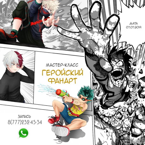 Мастер-класс «Геройский Фанарт» ⠀ 7 июля в 15:00 ⠀ На этом мастер классе мы: ️Окунёмся глубже в геройскую тематику одного из самых популярных аниме «Моя геройская академия» ️Освоим инструменты и материалы для создания манги ️Изучим особенности стиля Кохэя Хорикоси (автора манги «Моя геройская академия») ️Порисуем персонажей в необычных позах ️получим новый опыт, море удовольствия и возможность пообщаться с единомышленниками ⠀ Стоимость 5000тг Чтобы записаться или задать вопросы ⤵️