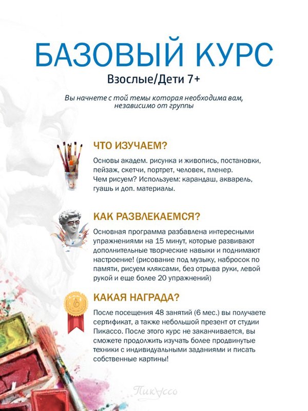 под музыку, наброски по памяти, рисуем кляксами, без отрыва руки, левой рукой и ещё более 20 упражнений) Какая награда? После посещения 48 занятий (6мес.) вы получаете сертификат + небольшой презент от студии Пикассо После этого курс не заканчивается, вы сможете продолжить изучать более продвинутые техники с индивидуальными заданиями и писать собственные картины Так же до 31 мая будет акция о которой мы расскажем в следующем посте По всем вопросам Желаем всем прекрасных майских праздников!