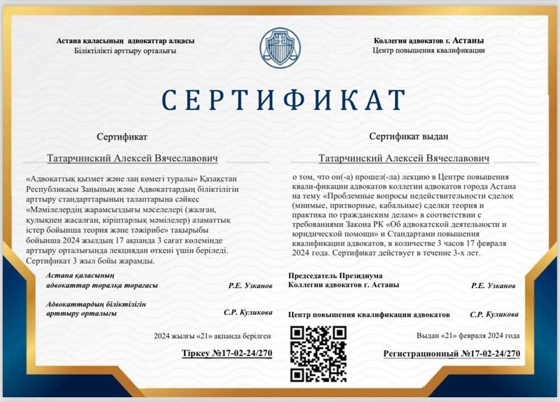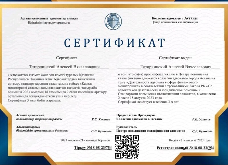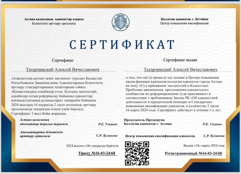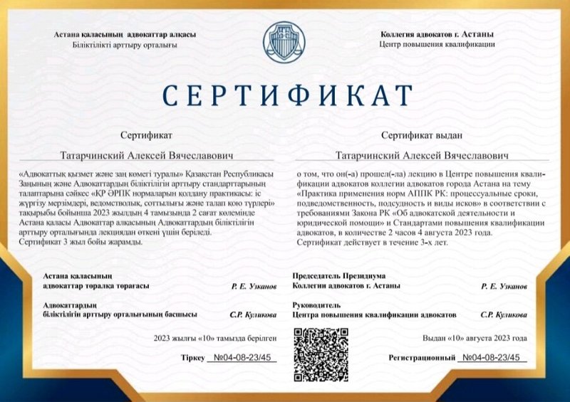 Средняя оценка заведения от пользователей Zoon.kz: 2. Вы можете написать свой отзыв об адвокатском кабинете Татарчинского А.В.!