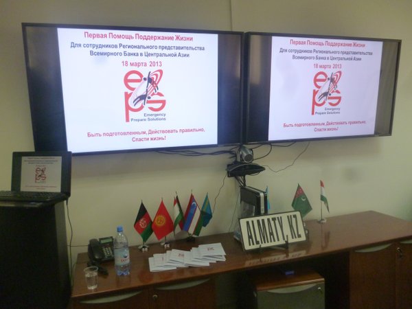 ь последующих осложнений в результате травмы или внезапного заболевания. Теоретическое и практическое содержание курса рассчитано на то, чтобы научить слушателей распознавать неотложные состояния и творчески пользоваться полученными знаниями в любой ситуации. Большое внимание уделяется профилактике заболеваний и травматизма, а также мерам обеспечения личной безопасности. Научившись правильно применять и адаптировать полученные навыки, слушатели смогут справиться с различными ситуациями, возникающими в повседневной жизни. Это придаст Вам уверенности в своих силах и умение успокоить окружающих. Методология Курсы проводят сертифицированные тренеры и инструкторы по первой помощи с большим опытом в обучении и работы в сфере медицины катастроф. Использование современных педагогических методов, рекомендованных ведущими международными организациями в области обучения первой помощи, помогут слушателям курсов получить теоретические знания и обсудить случаи из жизни, отработать навыки на современных манекенах (сердечно-легочная реанимация и искусственная вентиляция легких) и друг на друге (восстановительное положение, транспортировка пострадавшего, остановка кровотечения и др). Курс первой помощи при неотложной ситуации поддается адаптации в зависимости от региональных особенностей, уровня знания слушателей для того, чтобы при обучении делать акцент на наиболее необходимой для данной аудитории информации (сейсмически опасный район или промышленная зона с высоким уровнем производственного травматизма). По окончании курса слушатели будут уметь: Описать, как действовать на месте происшествия и как вызвать скорую помощь. Принять решение, когда и каким образом следует перенести пострадавшего с места происшествия, если ему угрожает опасность. Провести проверку жизненно важных функций организма пострадавшего и определить характер повреждений, включая травмы головы и позвоночника. Принять соответствующие меры при обнаружении сильного кровотечения. Определить отсутствие сознания у пострадавшего и принять соответствующие меры. Определить дыхательные расстройства у пострадавшего и принять соответствующие меры. Определить остановку сердца у пострадавшего и принять соответствующие меры. Принять соответствующие меры в случае серьезных ранений, ожогов и травм опорно-двигательного аппарата. Сертификат При успешном окончании курса участники получают сертификат. Сертификат указывает, что знания и практические навыки, полученные слушателями на курсах, соответствуют международным стандартам и руководству Международного Научного Консенсуса 2010 и что их владельцы могут оказывать первую помощь. Сертификат действителен в течение 2-х лет. Уже в течении 2-х лет ТОО EPS являются лидером продаж в данном направлении. Наши услуги выбирают известные в Республике Казахстана компании, в политике которых безопасность занимает важное место,в том числе:: Региональное Представительство Всемирного Банка в Центральной Азии. Представительство компании Катерпиллар С.А.Р.Л. в Алматы. Филиал компании КАЗАХМЫС Проджектс Би.Ви. в Казахстане. Филиал группы компаний AES в Алматы. Филиал компании SRK Consulting в Казахстане. Филиал компании Emerson Network Power в РК. ТОО Тойота Мотор Казахстан ТОО СП Кока-Кола Алматы Боттлерс ТОО БАСФ Центральная Азия 