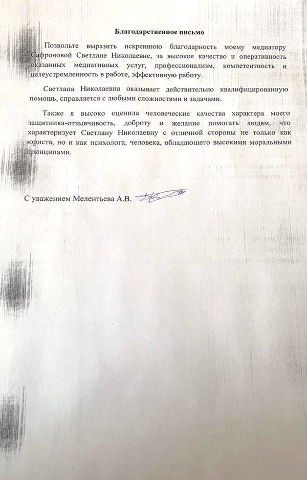ыражает искреннюю благодарность медиатору Сафроновой Светлане Николаевне за высокое качество и оперативность оказанных медиативных услуг, профессионализм, компетентность и эффективную работу. Также высоко оценили человеческие качества характера Сафроновой Светланы Николаевны, ее отзывчивость, доброту и желание помогать людям, что и охарактеризовали ее не только как юриста, но и психолога, человека, обладающего высокими моральными принципами. mpc-info.kz