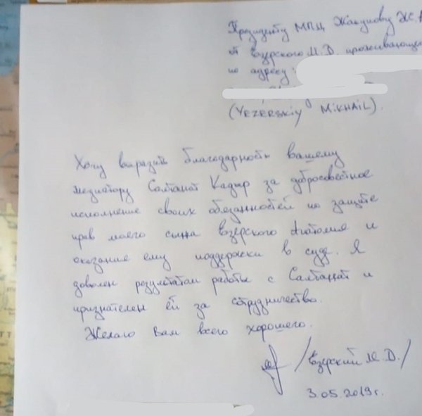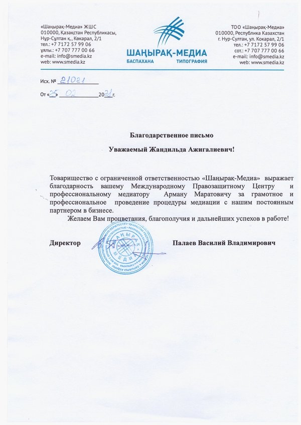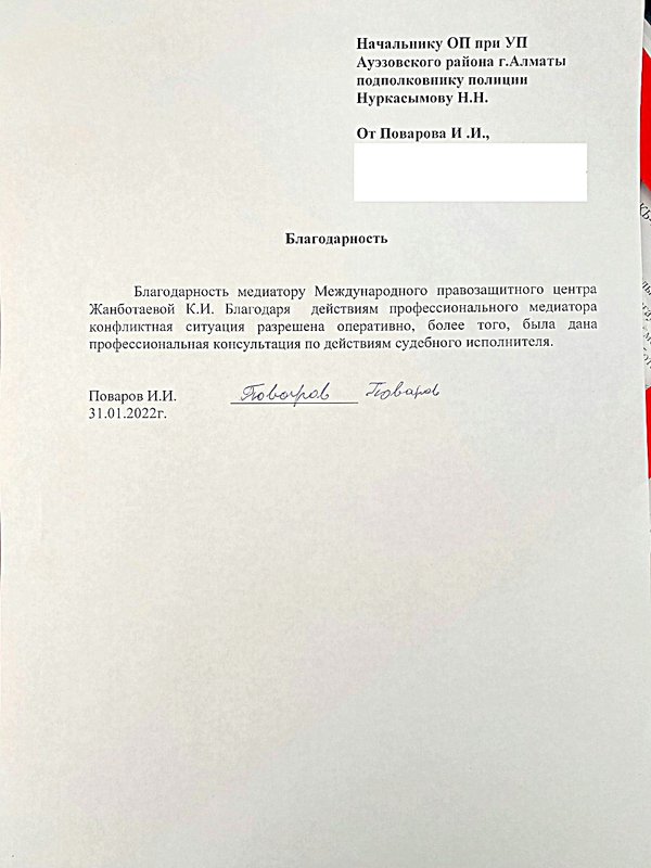 Медиатору Международного правозащитного центра Мажура Олегу гражданкой Власовой Н. выражена благодарность за помощь в решении ее вопроса. Медиаторов МПЦ отличает высокий профессионализм и качественный уровень работы. Медиаторы нашего Центра консультируют граждан по вопросам медиации в Центрах правовых услуг г.Астаны, г.Алматы, Алматинской, Мангистауской, Жамбылской, Павлодарской и других областей.
