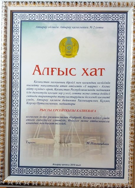 Атырауский суда № 2 Атырауской области поблагодарил за отличную работу и вклад в развитие медиации и примирительных процедур профессионального медиатора, руководителя Атырауского областного филиала Калиеву Рысты Ерсеитовну. mpc-info.kz