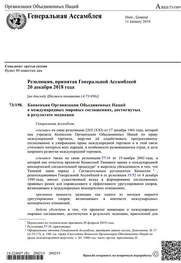 в 2019 году. Конвенция признает важность медиации в урегулировании международных коммерческих споров и ее использование в качестве альтернативы судебному урегулированию споров. Подробно с текстом Конвенции Вы можете ознакомиться на нашем сайте по ссылке: