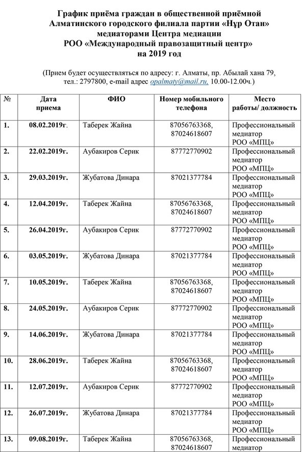 Профессиональные медиаторы РОО МПЦ г.Алматы дают консультации и ведут прием граждан по вопросам медиации и помогают урегулировать споры. Ежемесячно два раза в месяц медиаторы дежурят и оказывают помощь населению. Также бесплатные консультации по медиации Вы можете получить по тел. или по электронной почте: jandilda@mail.ru