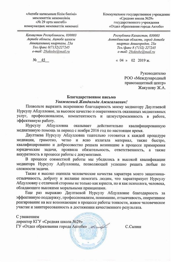 Благодарственное письмо медиатору МПЦ Даултаевой Нурсулу Средняя школа № 29 г.Актобе прислала благодарственное письмо профессиональному медиатору МПЦ Актюбинской области Даултаевой Нурсулу Абдулловне и поблагодарила ее за качество и оперативность медиативных услуг, профессионализм и компетентность. Медиатор Нурсулу Абдулловна на протяжении 3 лет оказывает школе медиативную помощь в урегулировании конфликтов. mpc-info.kz