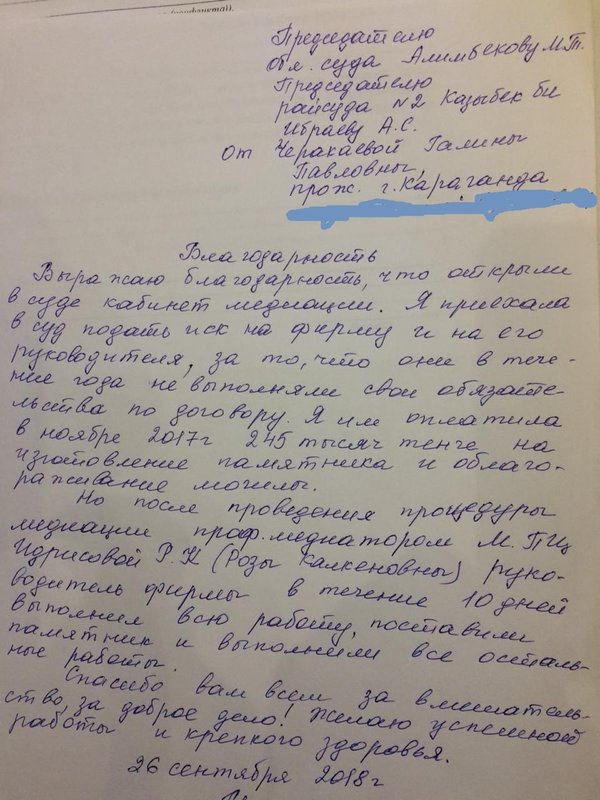 В РОО «МПЦ» поступили благодарственные письма от сторон медиации. Мы гордимся нашими профессиональными медиаторами, которые показали свой профессионализм в проведении медиации. Это руководитель филиала по г. Нұр-Сұлтан Лиля Ивановна Носаева и медиатор г. Павлодар Сафронова Светлана Николаевна. Поступил благодарственный отзыв посредством WhatsApp в адрес руководителя филиала по г. Нұр-Султан Носаевой Лиле Ивановны, где благодарят ее за профессионализм и качественно выполненную работу. Благодарственное письмо пришло от Мелентьевой А.В., где она в… — Читать дальше