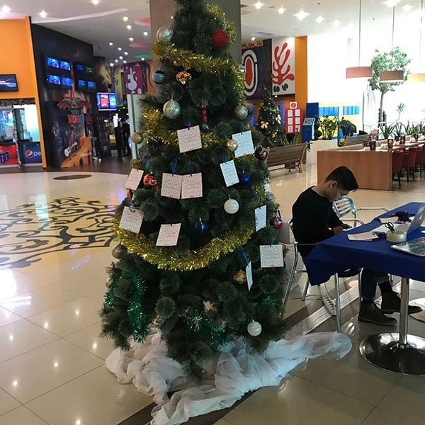 Olga Dilizhans (10.12.2017): Друзья, давайте поможем!…В Меге, возле кинотеатра стоит #ёлка, на ней висят бумажки с желаниями деток из детских домов Алматы, в основном это мало кто просит игрушки… Отрываешь бумажку, покупаешь #подарок и сдаёшь, там записывают твой телефон, после 20 декабря будут ездить, отдавать подарки, если есть желание, вам позвонят и можете проехать вместе в Детский дом. Давайте в этот сказочный