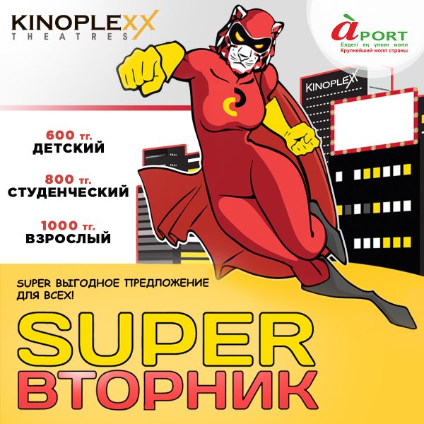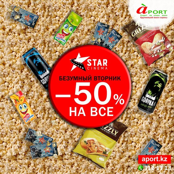 Безумный вторник в кинотеатре StarCinema! Каждый вторник в кинотеатре действует акция, которая точно будет по душе самым заядлым киноманам! Только в этот день недели, взрослые билеты по 1000 тг, студенческие по 800 тг и детские по 600 тг! А еще действуют скидки на бар — 50%!