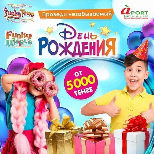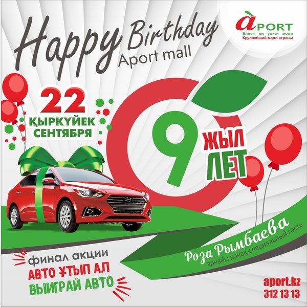та тіркеуден өтуді ұмытпаңыз. Апорт моллының туған күнін бізбен бірге атап өтіңіз. ️Барлық шаралар ақысыз болады. 21 сентября! 10-летие крупнейшего молла страны Апорт Уже 10 лет мы радуем своих любимых посетителей отличным шопингом, уникальными, незабываемыми развлечениями и замечательным отдыхом. В этот день на сцене будут выступать такие звезды, как: группа Ninety One, Беркут и Аиша, Нурболат Абдуллин и многие другие. И конечно же, долгожданный розыгрыш 2-комнатной квартиры в ЖК «Алатау Сити»! А также будет проходить розыгрыш двух путевок на двоих в Майами и одного миллиона тенге от компании Kinopark-Kinoplexx Theatres! Не забудьте пройти повторную регистрацию на розыгрыш с 20 сентября по 21 сентября 15:00. Отмечайте день рождения молла Апорт вместе с Нами. ️ Все мероприятия будут бесплатные