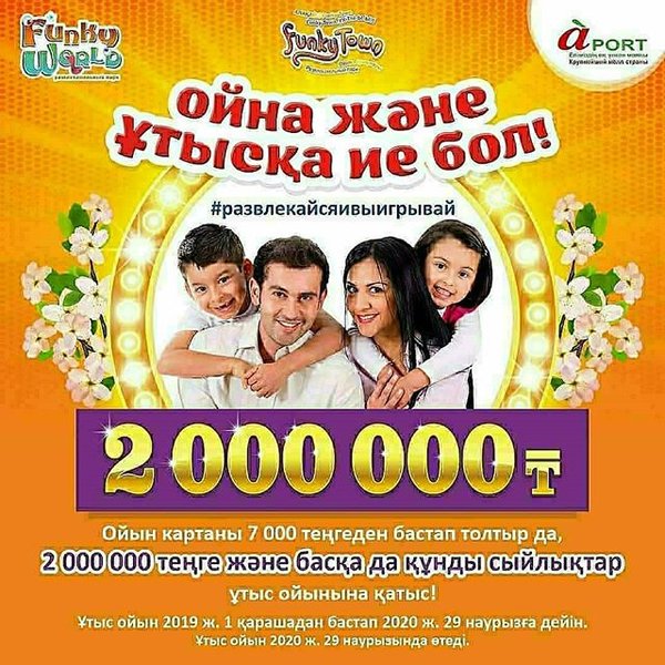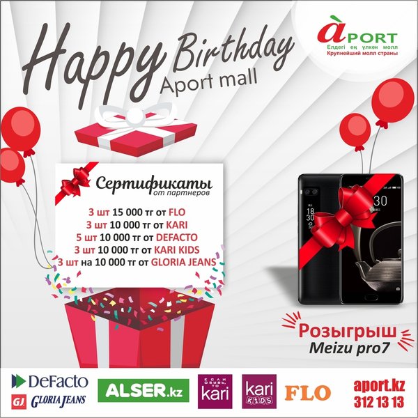 азина KARI! Для участия необходимо: совершить покупки в магазине KARI 22 сентября с 10. 00 до 16. 30 на сумму от 15 000 тенге и выше. 4. 3 Сертификата номиналом 10 000 тенге от магазина KARI KIDS! Для участия необходимо: совершить покупки в магазине KARI KIDS 22 сентября с 10. 00 до 16. 30 на сумму от 15 000 тенге и выше. 5. 3 Сертификата номиналом 15 000 тенге от магазина FLO! Для участия необходимо: совершить покупки в магазине FLO 22 сентября с 10. 00 до 16. 30 на сумму от 15 000 тенге и выше. 6. 3 Сертификата номиналом 10 000 тенге от магазина GLORIA JEANS! Для участия необходимо: совершить покупки в магазине GLORIA JEANS 22 сентября с 10. 00 до 16. 30 на сумму от 15 000 тенге и выше. Розыгрыш состоится 22 сентября в 16 30 на сцене мероприятия 9 летия молла Апорт. На парковке новой очереди. При себе обязательно иметь удостоверение личности!