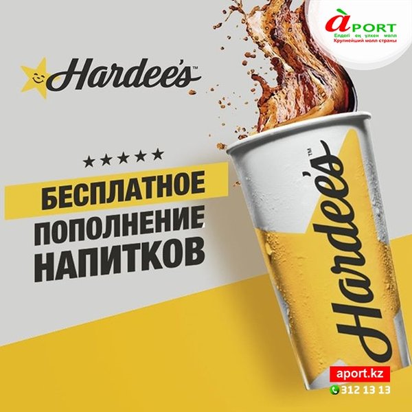 С услугой Free Refill от Hardee’s вам точно не придется переживать за то, что вам не хватит напитка! У нас можно пополнять свой стаканчик сколько угодно!⠀ ⠀ 2 этаж крупнейшего молла страны Апорт