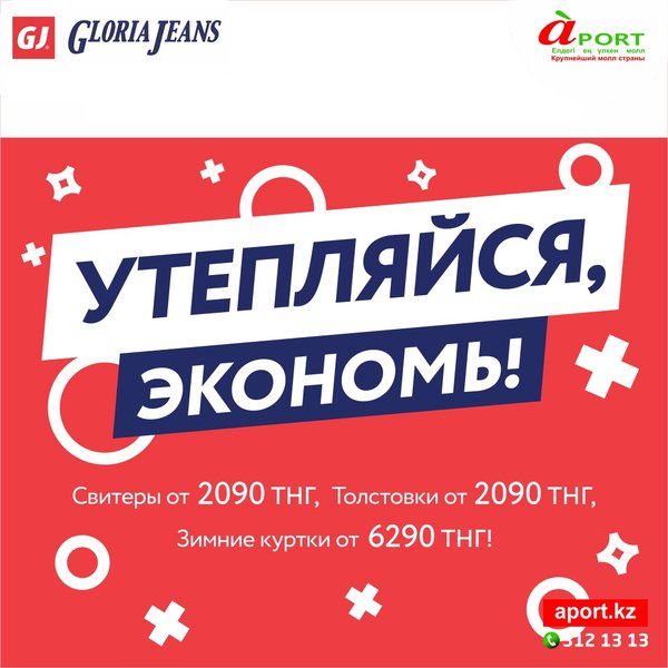 УТЕПЛЯЙСЯ, ЭКОНОМЬ! Свитеры от 2090 тг, толстовки от 2090 тг, зимние куртки от 6290 тг Магазин Gloria Jeans, новая очередь молла Апорт