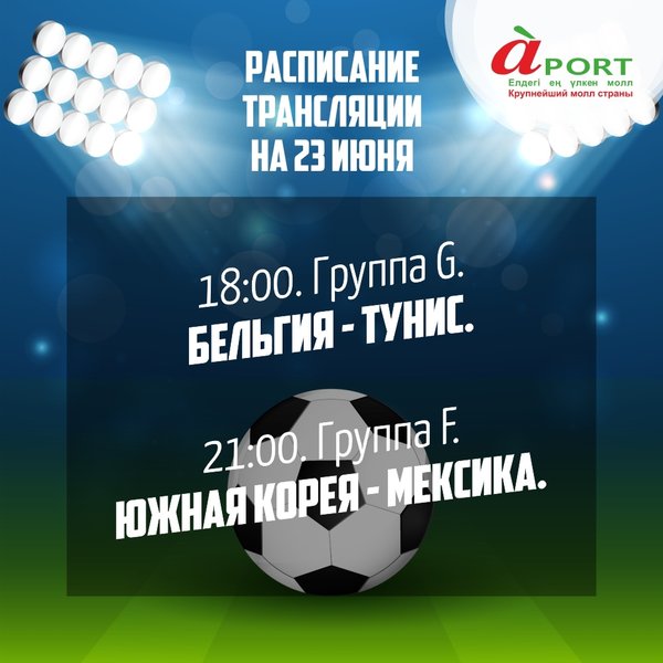 Дорогие друзья! Молл Апорт приглашает Вас на просмотр матчей Чемпионата Мира по футболу! Трансляции будут проходить каждый день в новой очереди молла, на площади Пьяцца, возле «лестницы любви» Сегодня в 18:00 стартует матч Бельгия-Тунис. И следующий матч в 21:00 — Южная Корея-Мексика. Ждем Вас на просмотр матчей в крупнейшем молле страны!!! ВСЕ НА ФУТБОЛ!